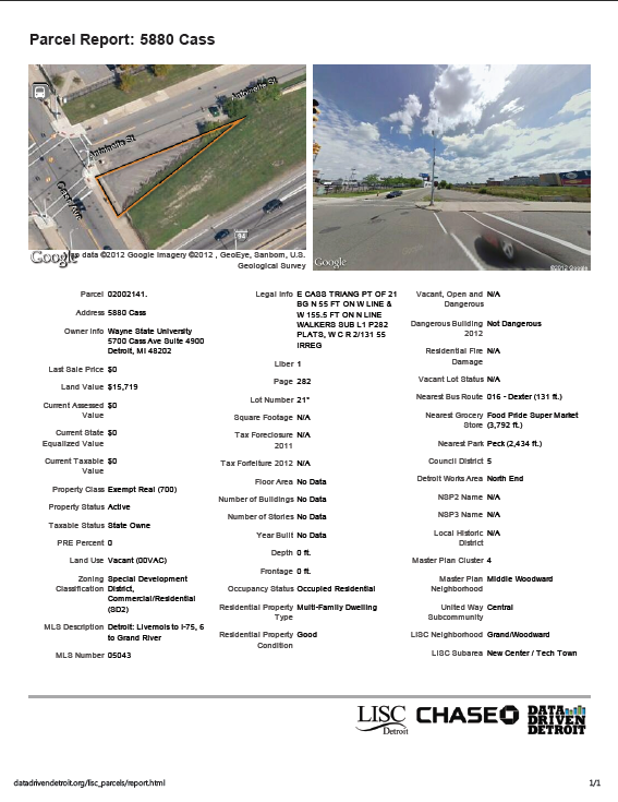 Up-to-date property information is essential to revitalization efforts in Detroit’s neighborhoods. Data at the parcel level provides the most detailed and fine-grained picture of local conditions. To support Detroit LISC’s Building Sustainable Communities Initiative, Data Driven Detroit (D3) was pleased to create a tool that supported planning and development in the Grand/Woodward, Grandmont Rosedale, and Springwells Village neighborhoods. An interactive map combined multiple public data sources in one interface, greatly reducing the time needed to research parcel-level information.