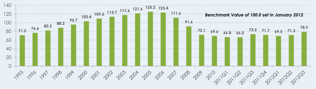 As was the case with the strong income gains reported earlier in the week, Detroit’s strong percentage growth is assisted by the fact that we are starting from such a low base. The region hit a low of $64,470 in April 2011, according to Case-Shiller, compared to a January 2000 benchmark of $100,000 [1]. In September 2012 that home now goes for $79,820.